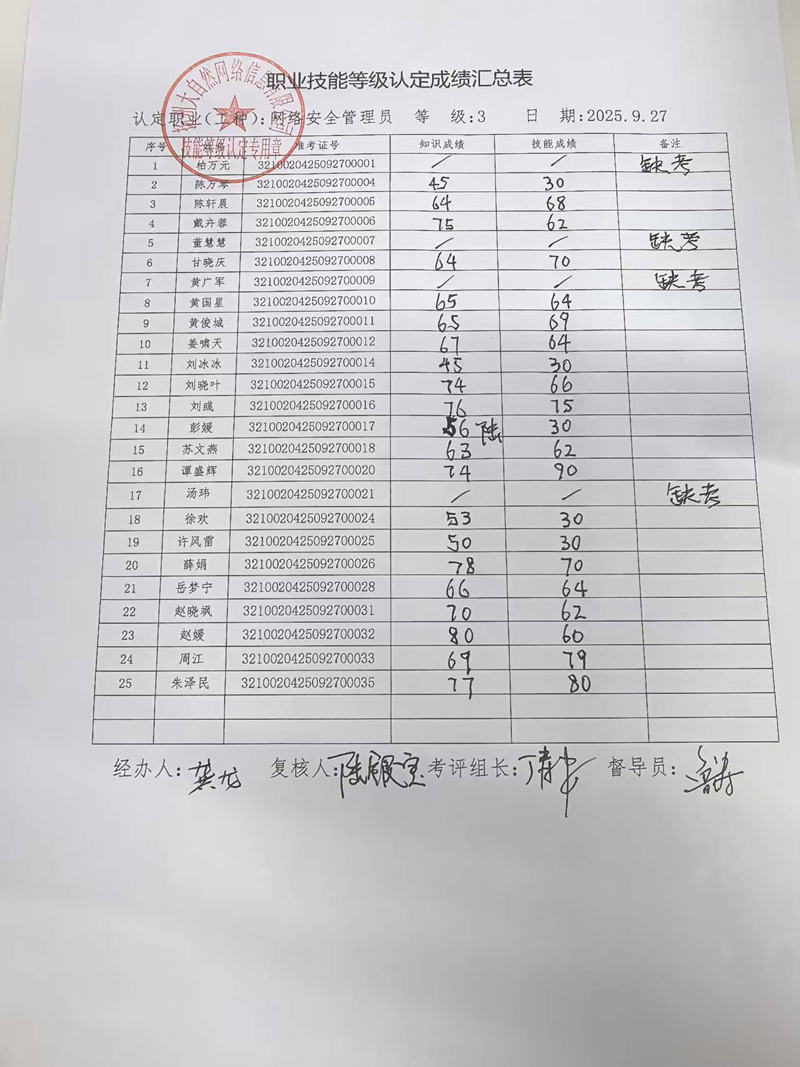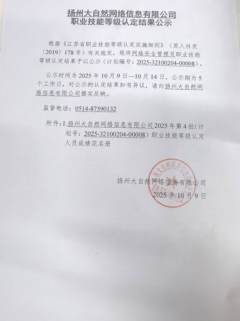 扬州大自然网络信息有限公司职业技能等级认定结果公示
