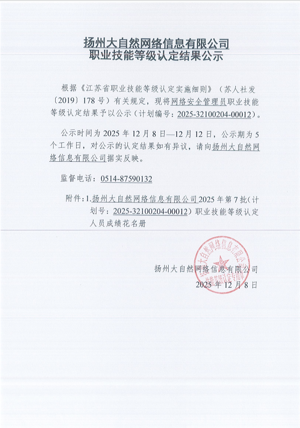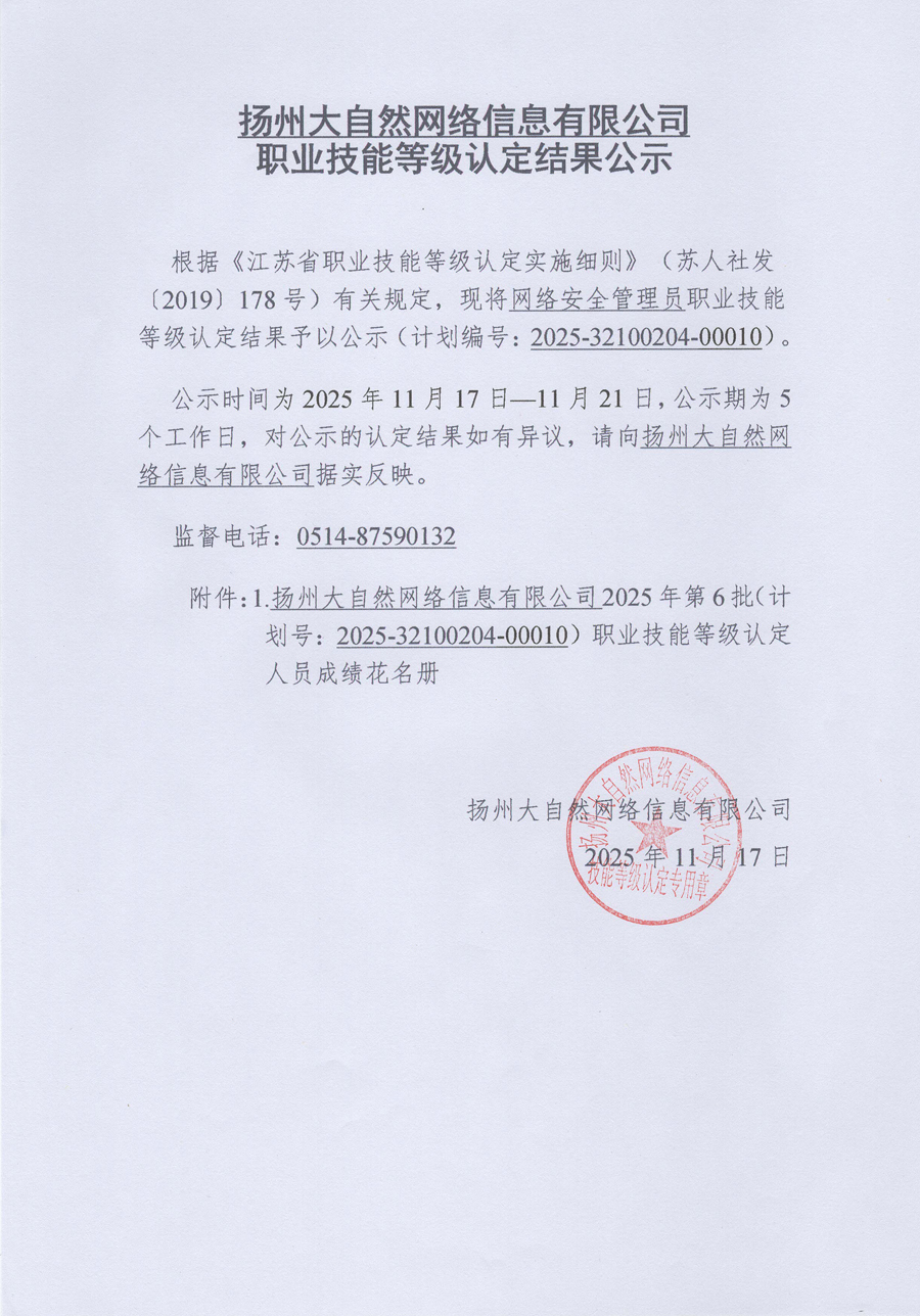 扬州大自然网络信息有限公司职业技能等级认定公示