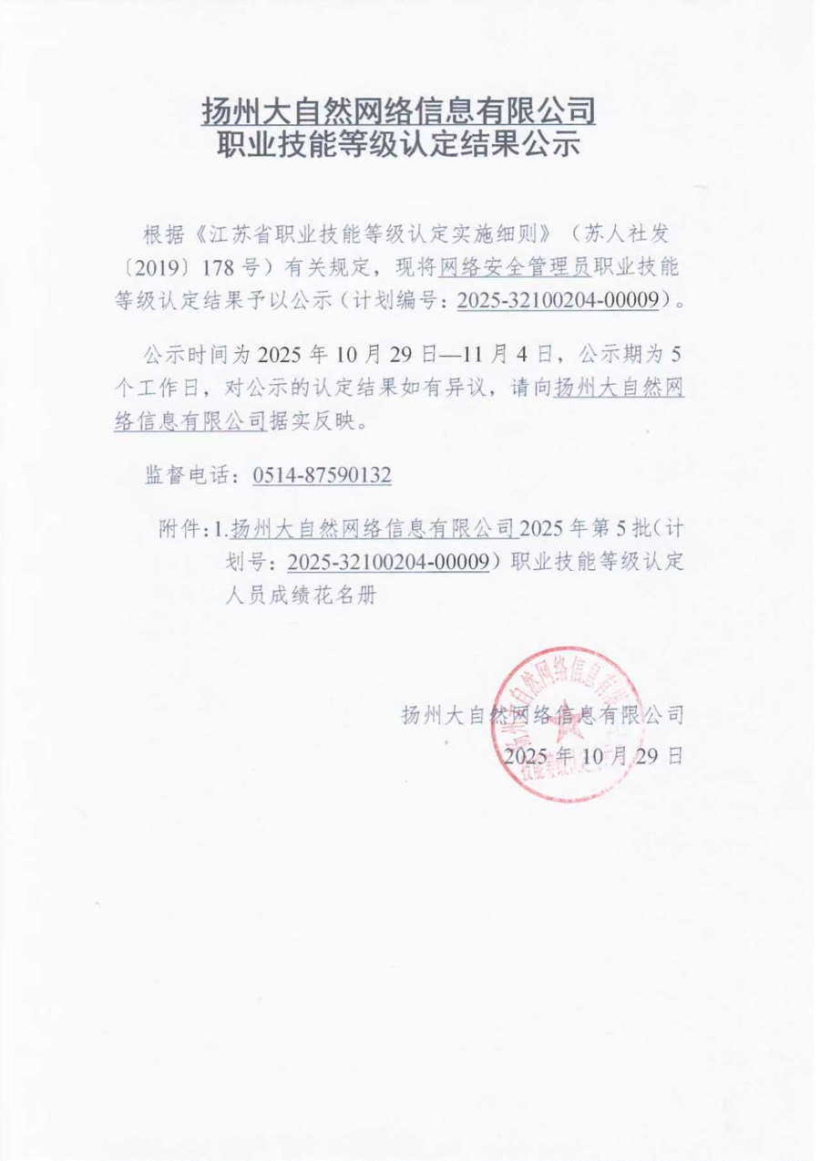 扬州大自然网络信息有限公司职业技能等级认定公示