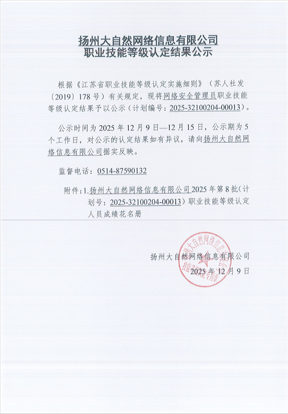 扬州大自然网络信息有限公司职业技能等级认定公示