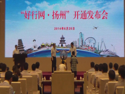 2014年6月26日下午,在扬州市交通运输局大力支持下,由公司倾力打造的“好行网•扬州”“www.yzhxw.cn”出行服务平台开通会在市会议中心圆满举行。省交通运输厅厅长游庆仲和副市长丁一共同启动了平台开通按钮,江苏省交通运输厅总工程师、党组成员金凌等相关领导出席了会议,市公安局、建设局、气象局、园林局、旅游局、广电集团等相关单位负责人及建设单位扬州大自然网络信息有限公司、扬州广电网络公司代表共100余人参加了会议, 会议由市交通运输局局长王骏主持。