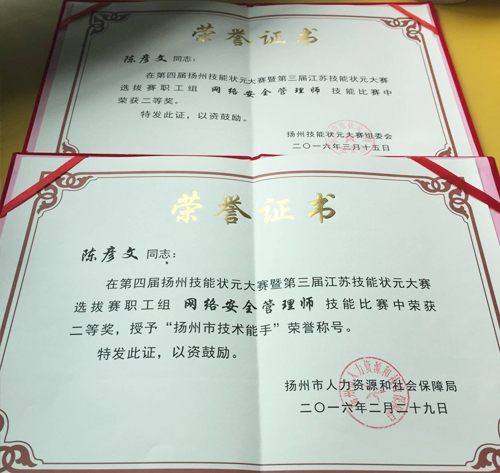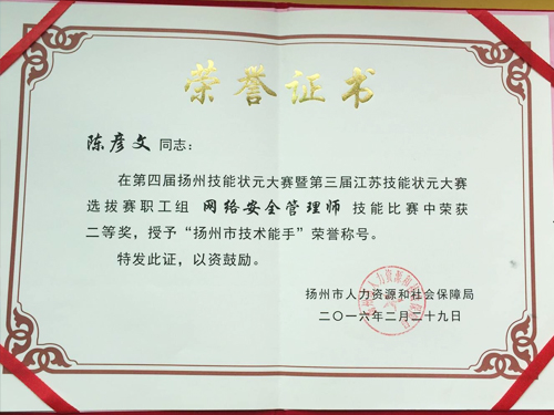 经过紧张、激烈的角逐,我公司陈彦文脱颖而出,荣获职工组网络安全管理师二等奖,并被授予“扬州市技术能手”荣誉称号!扬州大自然网络有限公司荣获“高技能人才摇篮奖”奖牌!